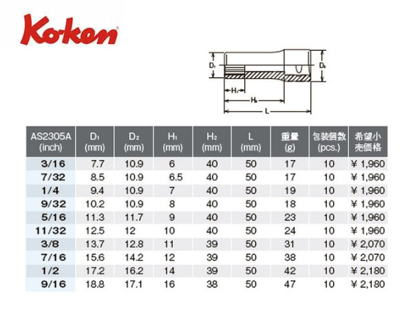 Ko-ken(コーケン/山下工業研究所)1/4”航空規格ディープソケットセット(AS954)