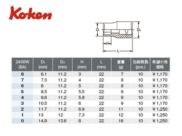 ● Ko-ken(コーケン)の差し込み角1/4”(6.35mm)のソケットです。 ● 昔のミニやトライアンフなどの英国車に使われている英国規格のソケットレンチ(BA)です。 ● スタンダードタイプです。 ● 「6角ソケット(6ポイント)」のみとなります。 ● どのサイズもネコポスで発送が出来ます。