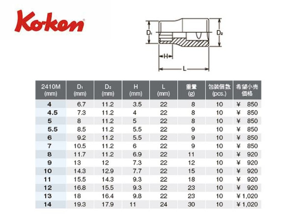 ● Ko-ken(コーケン)の差し込み角1/4”(6.35mm)のソケットです。 ● 通常のソケットとは形状が違い、徹底した面接触設計によりトルクの伝達率を飛躍的に向上させています。 ● スタンダードタイプです。 ● ソケット専用メーカーですのでサイズは4mm〜14mmまで豊富なラインナップがあります。 ● どのサイズもネコポスで発送が出来ます。