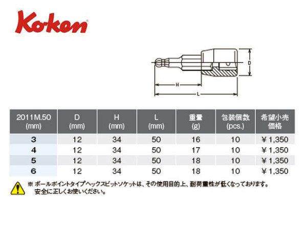 ● Ko-ken(コーケン)の差し込み角1/4”(6.35mm)のソケットです。 ● ソケットの先にヘックスレンチ(6角レンチ)がついたヘックスビットソケットです。差込角度を変えられるボールポイントです。 ● スタンダードタイプです。全長50mmです。 ● どのサイズもネコポスで発送が出来ます。