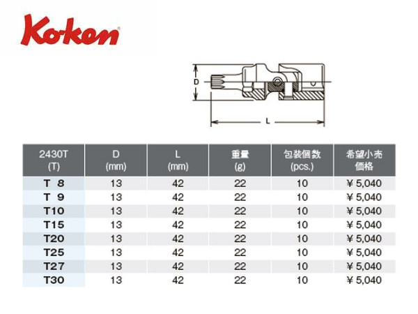 ● Ko-ken(コーケン)の差し込み角1/4”(6.35mm)のソケットです。 ● ソケットの先にトルクスレンチ(TORX/torx)がついたオス型のトルクスビットソケットです。 ● 角度が変えられるユニバーサルジョイント型のソケットです。 ● どのサイズもネコポスで発送が出来ます。