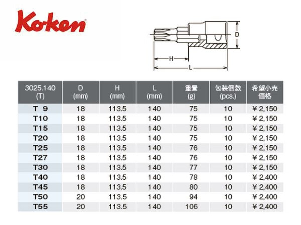 ● Ko-ken(コーケン)の差し込み角3/8”(9.5mm)のソケットです。 ● ソケットの先にトルクスレンチ(TORX/torx)がついたオス型のトルクスビットソケットです。 ● ロングタイプです。全長140mmです。 ● どのサイズもネコポスで発送が出来ます。