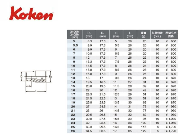 Ko-ken(コーケン/山下工業研究所)3/8”ソケット(ミリ)【5〜19mm ばら売り】