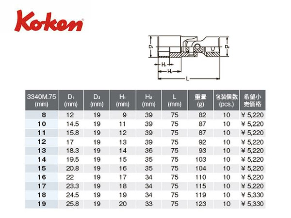 Ko-ken(コーケン/山下工業研究所)3/8”ユニバーサルディープソケット(ミリ)【8〜17mm ばら売り】