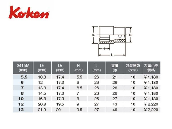 ● Ko-ken(コーケン)の差し込み角3/8”(9.5mm)のソケットです。 ● オイル交換時などに使われている四角型のボルトを回すためのソケットです。ミリサイズ、インチサイズともにあるのでサイズには注意が必要です。 ● どのサイズもネコポスで発送が出来ます。