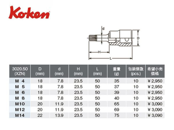 Ko-ken(コーケン/山下工業研究所)3/8”3重4角ビットソケット,トリプルスクエアビットソケット,スタンダードタイプ【全長50mm,M4〜M14 ばら売り】