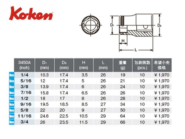 ● Ko-ken(コーケン)の差し込み角3/8”(9.5mm)のソケットです。