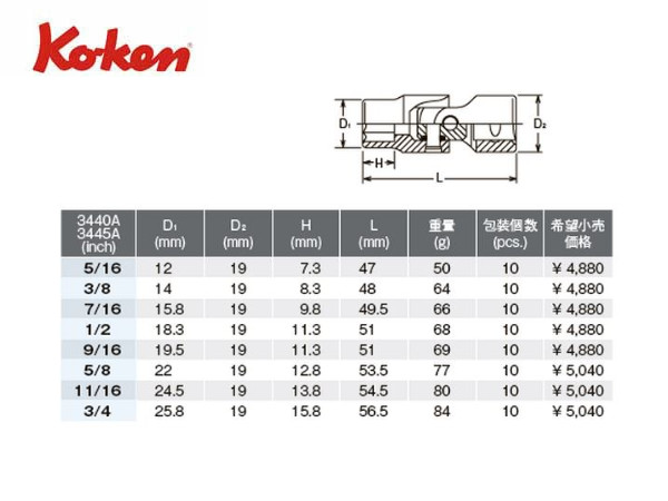 Ko-ken(コーケン/山下工業研究所)3/8”ユニバーサルソケット(インチ)【5/16”〜5/8” ばら売り】
