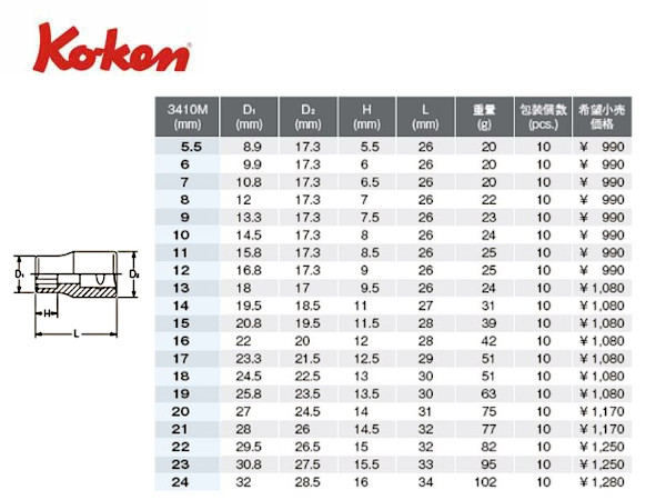 ● Ko-ken(コーケン)の差し込み角3/8”(9.5mm)のソケットです。 ● 通常のソケットとは形状が違い、徹底した面接触設計によりトルクの伝達率を飛躍的に向上させています。 ● スタンダードタイプです。 ● ソケット専用メーカーですのでサイズは5.5mm〜24mmまで豊富なラインナップがあります。こちらのページではネコポスで発送が出来ない大きめのサイズ(20mm〜24mmまで)がバラで選べます。