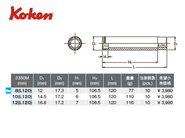 Ko-ken(コーケン/山下工業研究所)3/8”ナットグリップエクストラディープソケット(ミリ)【品番 3350M-L120】 | 正栄機工輸入センター