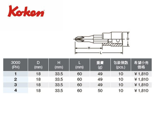 Ko-ken(コーケン/山下工業研究所)3/8”プラスドライバービットソケット【品番 3000-PH】 | 正栄機工輸入センター