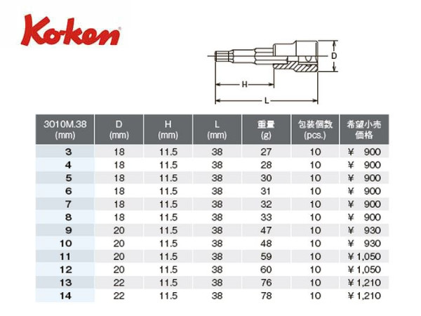 Ko-ken(コーケン/山下工業研究所)3/8”ヘックスビットソケット,ショートタイプ(ミリ)【全長38mm,3〜14mm ばら売り】