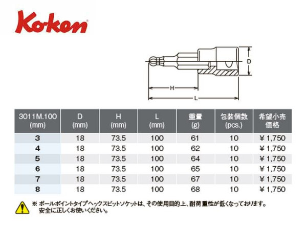 Ko-ken(コーケン/山下工業研究所)3/8”ヘックスビットソケット,ボールポイント,ロングタイプ(ミリ)【全長100mm,3〜8mm ばら売り】