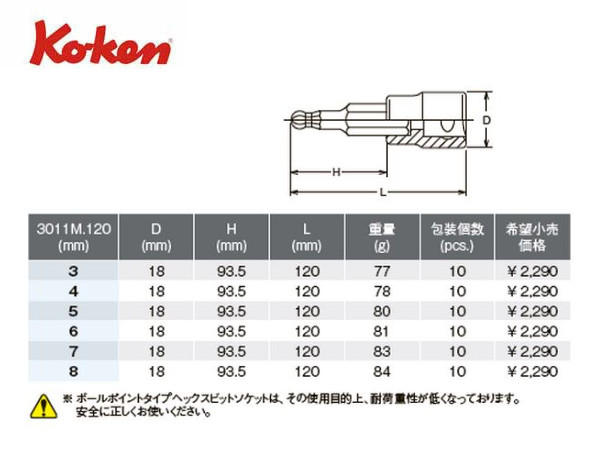 Ko-ken(コーケン/山下工業研究所)3/8”ヘックスビットソケット,ボールポイント,ロングタイプ(ミリ)【全長120mm,3〜8mm ばら売り】