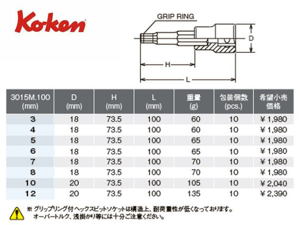 ※グリップリング付きヘックスビットソケットは構造上、通常のものより耐荷重性が低くなっております。オーバートルク、浅掛かり等には十分に注意しご使用下さい。