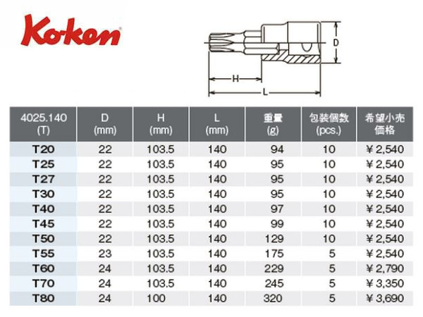 ● Ko-ken(コーケン)の差し込み角1/2”(12.7mm)のソケットです。 ● ソケットの先にトルクスレンチ(TORX/torx)がついたオス型のトルクスビットソケットです。 ● ロングタイプです。全長140mmです。 ● どのサイズもネコポスで発送が出来ます。