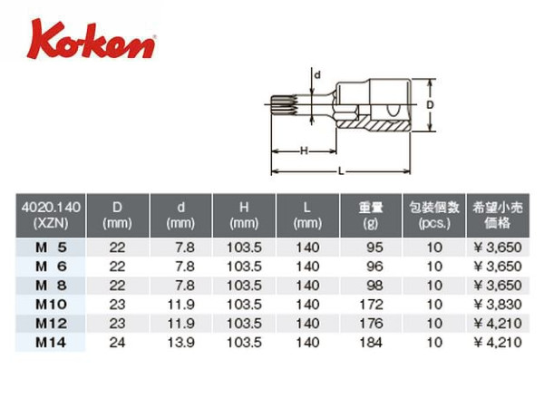 Ko-ken(コーケン/山下工業研究所)1/2”3重4角ビットソケット,トリプルスクエアビットソケット,ロングタイプ【全長140mm,M5〜M14 ばら売り】
