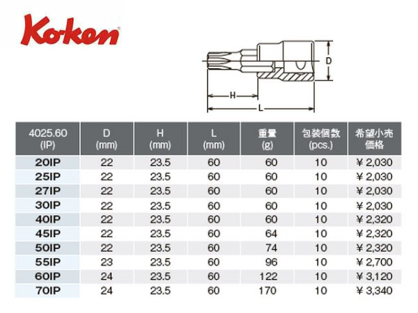 Ko-ken(コーケン/山下工業研究所)1/2”トルクスプラスビットソケットレンチ,ショートタイプ【全長60mm,20IP〜70IP ばら売り】