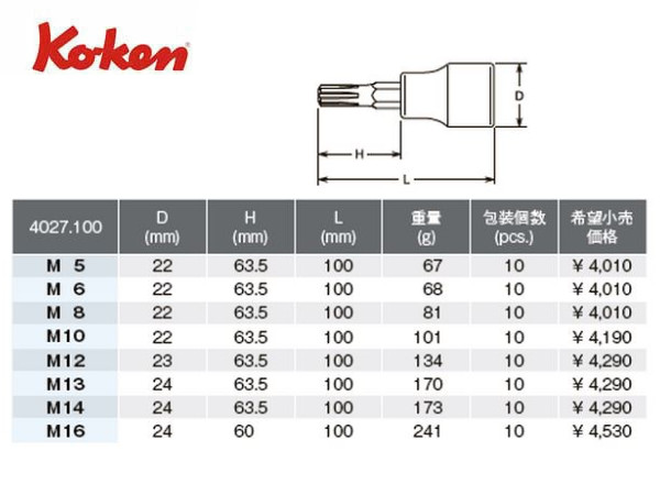 Ko-ken(コーケン/山下工業研究所)1/2”CVビットソケットレンチ,スタンダードタイプ【全長100mm,M5〜M16 ばら売り】