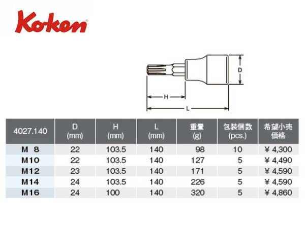 ● Ko-ken(コーケン)の差し込み角1/2”(12.7mm)のソケットです。 ● CV(Ribe CV)という形状のボルトを回す専用のビットソケットです。 ● ロングタイプです。全長140mmです。 ● ソケット専用メーカーですのでサイズはM8~M16まで豊富なラインナップがあります。 ● どのサイズもネコポスで発送が出来ます。