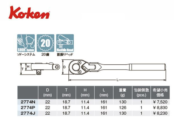 Ko-ken(コーケン/山下工業研究所)1/4”首振りラチェットハンドル,スタンダード,樹脂グリップ【品番 2774J】