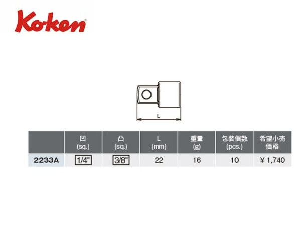 ● Ko-ken(コーケン)の差し込み角1/4”(6.35mm)の変換アダプターです。 ● 差込角1/4”(6.35mm)を3/8”(9.5mm)を変える工具です。