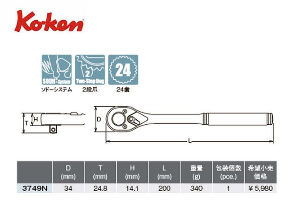 Ko-ken(コーケン/山下工業研究所)3/8”ラチェットハンドル,スタンダード,セレーショングリップ【品番 3749N】