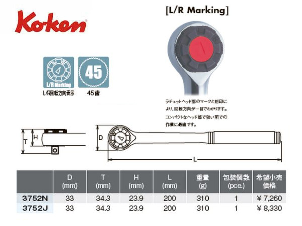 Ko-ken(コーケン/山下工業研究所)3/8”ラウンドヘッドラチェットハンドル,セレーショングリップ【品番 3752N】