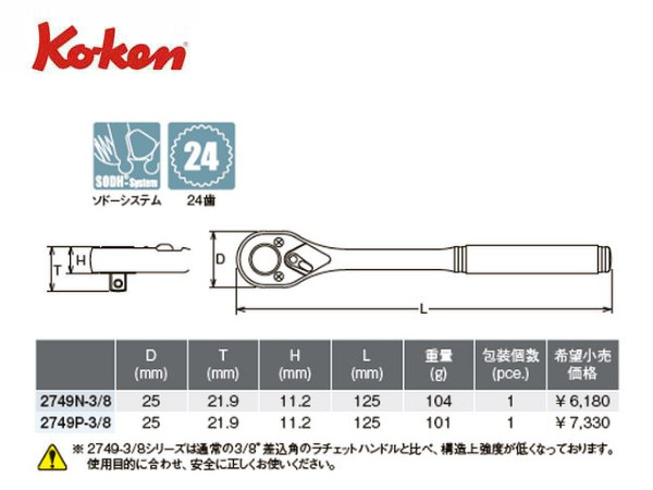 Ko-ken(コーケン/山下工業研究所)3/8”ラチェットハンドル,コンパクト,スタンダード,セレーショングリップ【品番 2749N-3/8】