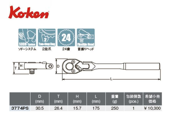 Ko-ken(コーケン/山下工業研究所)3/8”首振りラチェットハンドル,ショート,ポリッシュグリップ【品番 3774PS】