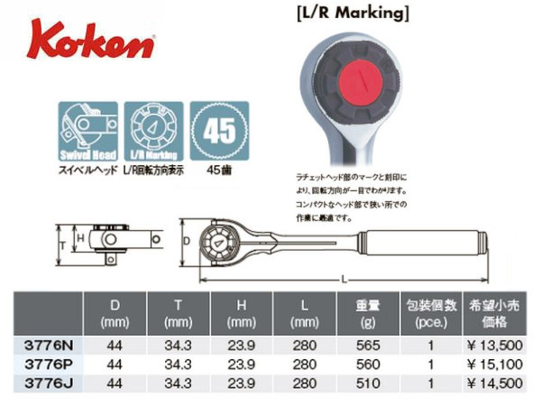 Ko-ken(コーケン/山下工業研究所)3/8”スイベルヘッドラチェットハンドル,樹脂グリップ,フルターン【品番 3776J】