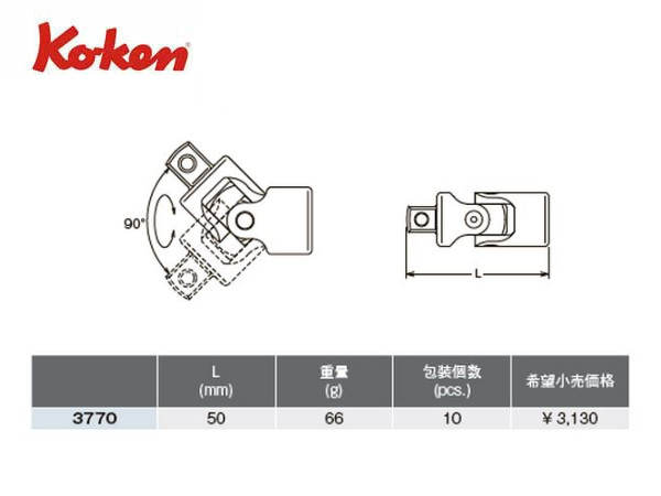 ● Ko-ken(コーケン)の差し込み角3/8”(9.5mm)のユニバーサルジョイントです。 ● ソケットとハンドルの間に入れることで角度を変える工具です。 ● 左右に45度づつ(合わせて90度まで)角度が付けられます。