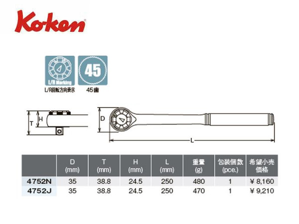 Ko-ken(コーケン/山下工業研究所)1/2”ラウンドヘッドラチェットハンドル,セレーショングリップ【品番 4752N】
