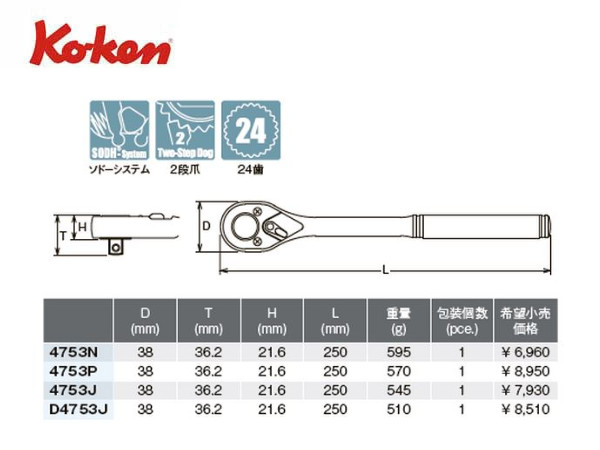 Ko-ken(コーケン/山下工業研究所)1/2”ラチェットハンドル,スタンダード,樹脂グリップ【品番 D4753J】
