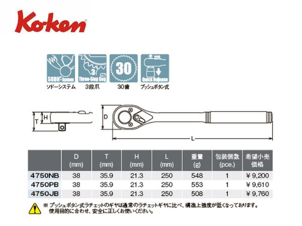Ko-ken(コーケン/山下工業研究所)1/2”ラチェットハンドル,スタンダード,樹脂グリップ,クイックリリース/プッシュボタン式【品番 4750JB】