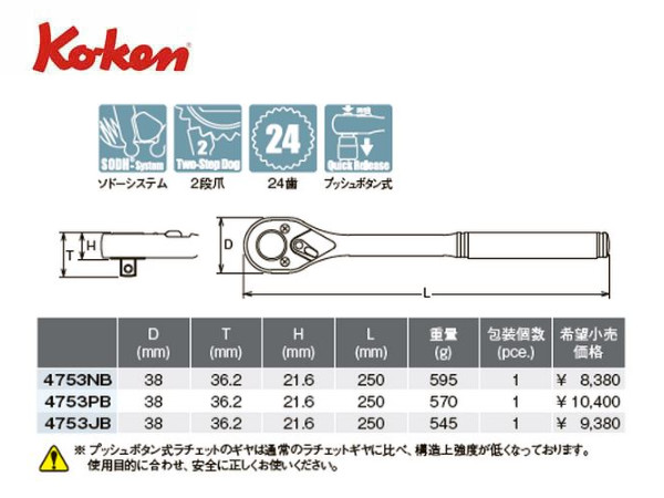 Ko-ken(コーケン/山下工業研究所)1/2”ラチェットハンドル,スタンダード,セレーショングリップ,クイックリリース/プッシュボタン式【品番 4753NB】