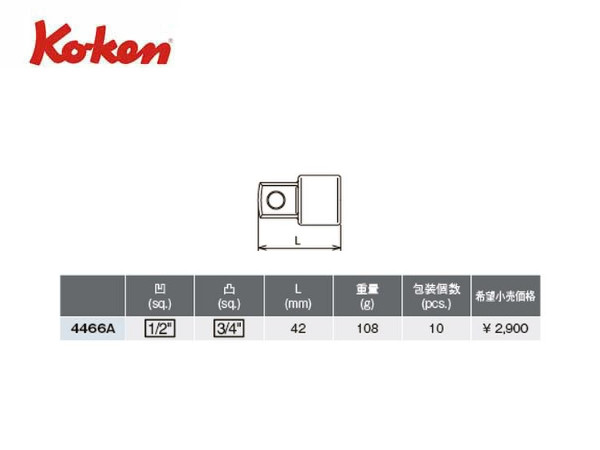● Ko-ken(コーケン)の差し込み角1/2”(12.7mm)の変換アダプターです。 ● 差込角1/2”(12.7mm)を3/4”(19mm)を変える工具です。