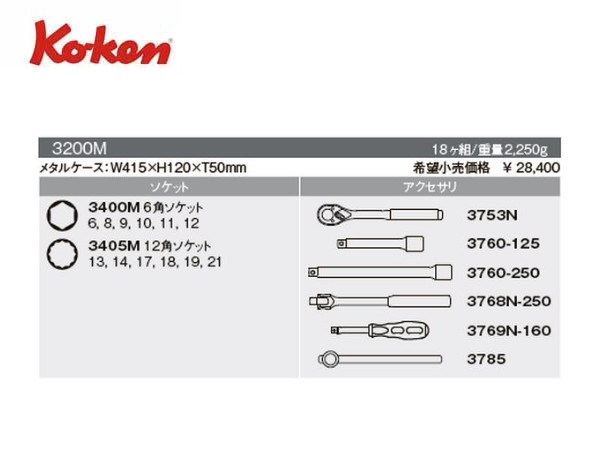Ko-ken(コーケン/山下工業研究所)3/8”ツールセット,18点【品番 3200M】