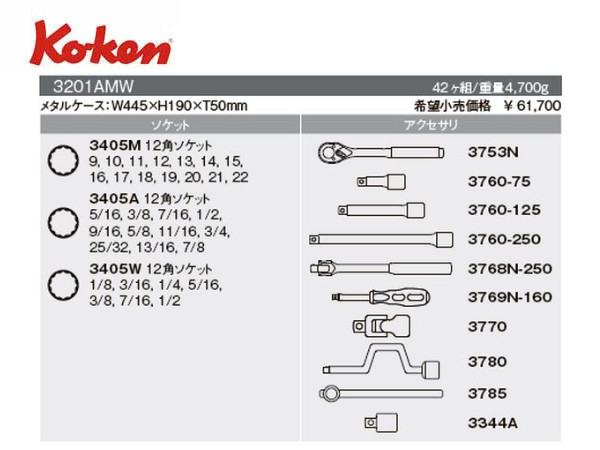 Ko-ken(コーケン/山下工業研究所)3/8”ツールセット,42点【品番 3201AMW】