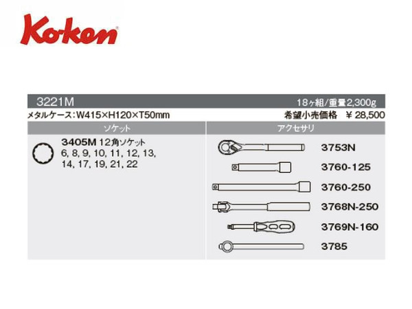 Ko-ken(コーケン/山下工業研究所)3/8”ツールセット,18点【品番 3221M】