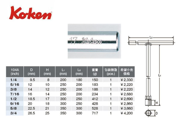 ● Ko-ken(コーケン)のT型ボックスレンチです。 ● T型ハンドルの先に6角ソケットがついた工具です。 ● サイズは1/4”〜3/4”まで豊富なラインナップがあります。こちらのページではサイズ80で発送ができる大きめのサイズ(1/2”〜3/4”まで)がバラで選べます。