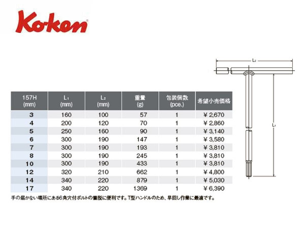 ● Ko-ken(コーケン)のT型レンチです。 ● T型ハンドルの先にヘックスレンチがついた工具です。 ● サイズは3mm~17mmまで豊富なラインナップがあります。こちらのページではサイズ60で発送が出来る小さめのサイズ(3mm〜10mmまで)がバラで選べます。